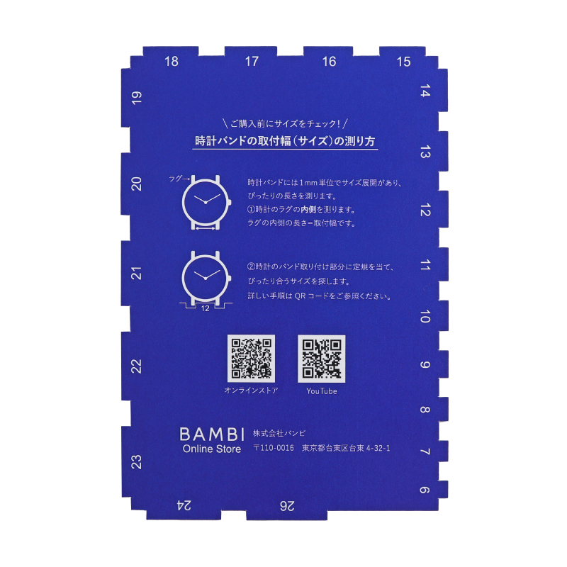 従来のミリ幅定規をはがきサイズにし、幅ごとの目盛りがあるため測定ミスを防げます。厚紙製でしっかりしており、時計バンド交換が初めての方でも安心です。