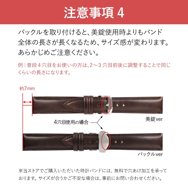 通常の美錠タイプのバンドでは、着脱のたびに曲げ部分や穴付近に負担がかかり、革の劣化が進みます。