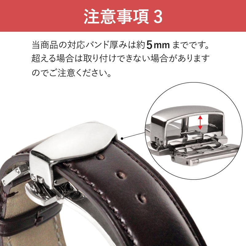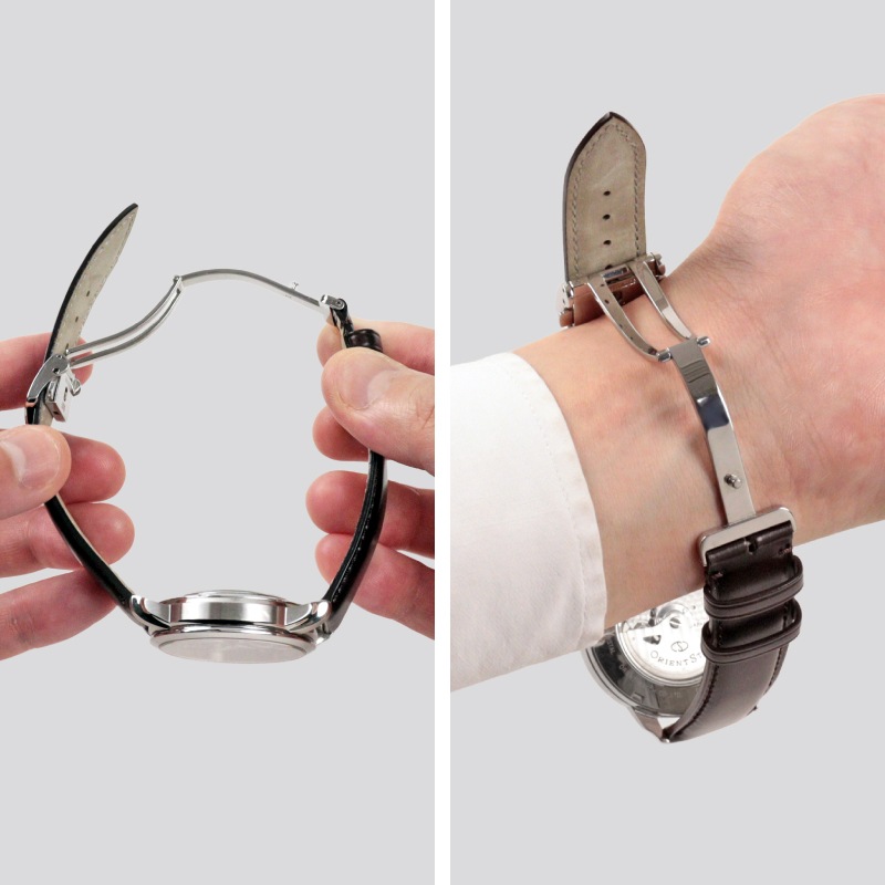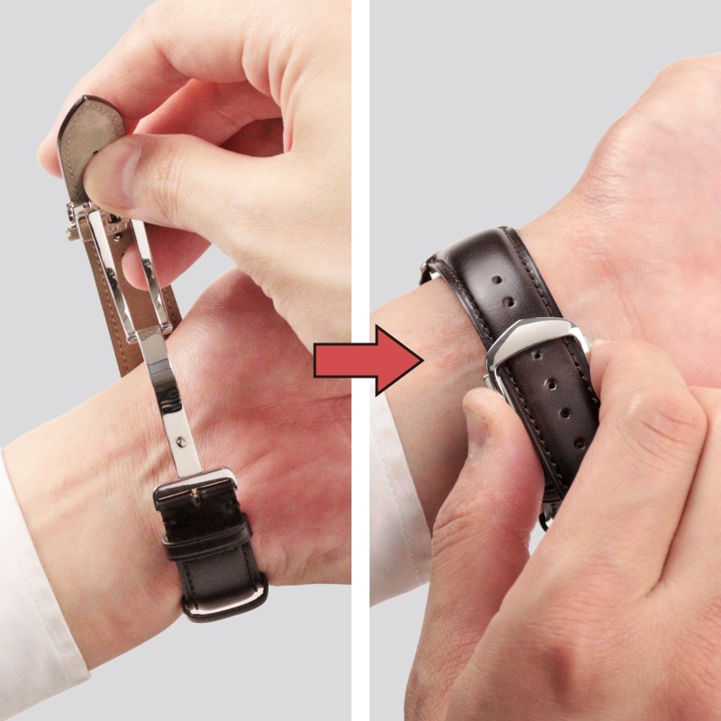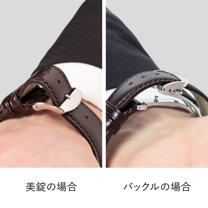 着脱時に小穴につく棒を通す美錠タイプのレザーバンドと比べ、時計を落下させるリスクが軽減し、大切な時計をより安全にお使いいただけます。