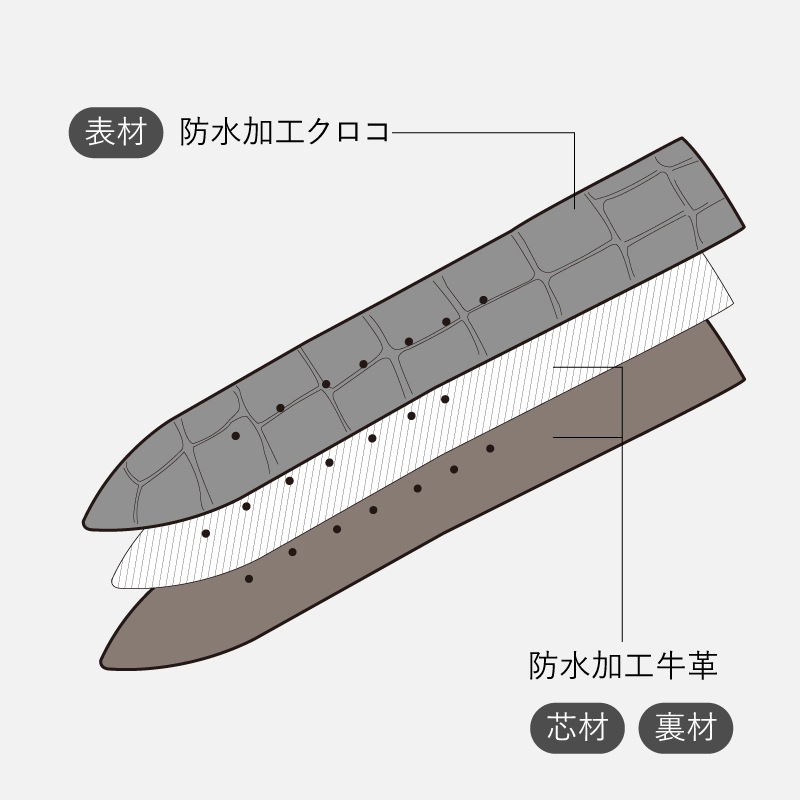 防水仕様なのは表材のクロコダイルだけではなく、バンドの芯材、裏材の天然牛革にも防水加工を施しています。