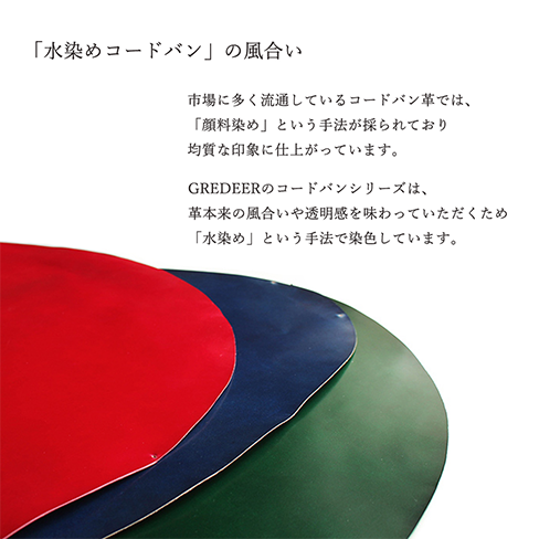 グレディアのコードバンは水染め製法を採用。透明感あるナチュラルな艶感に仕上げた革をスマートで使用感の良い小物に仕立てました。
