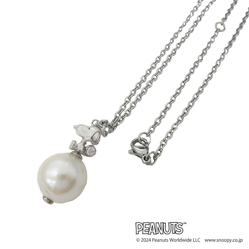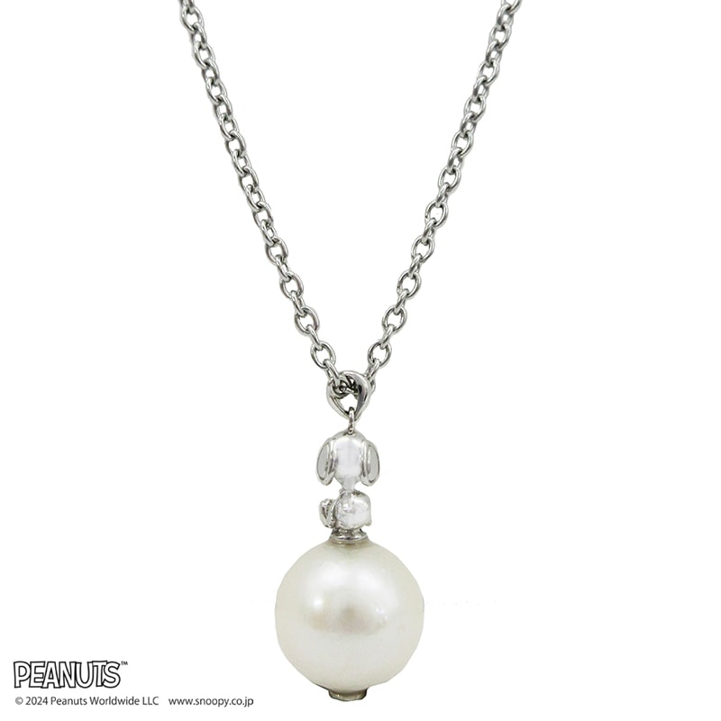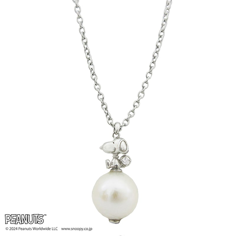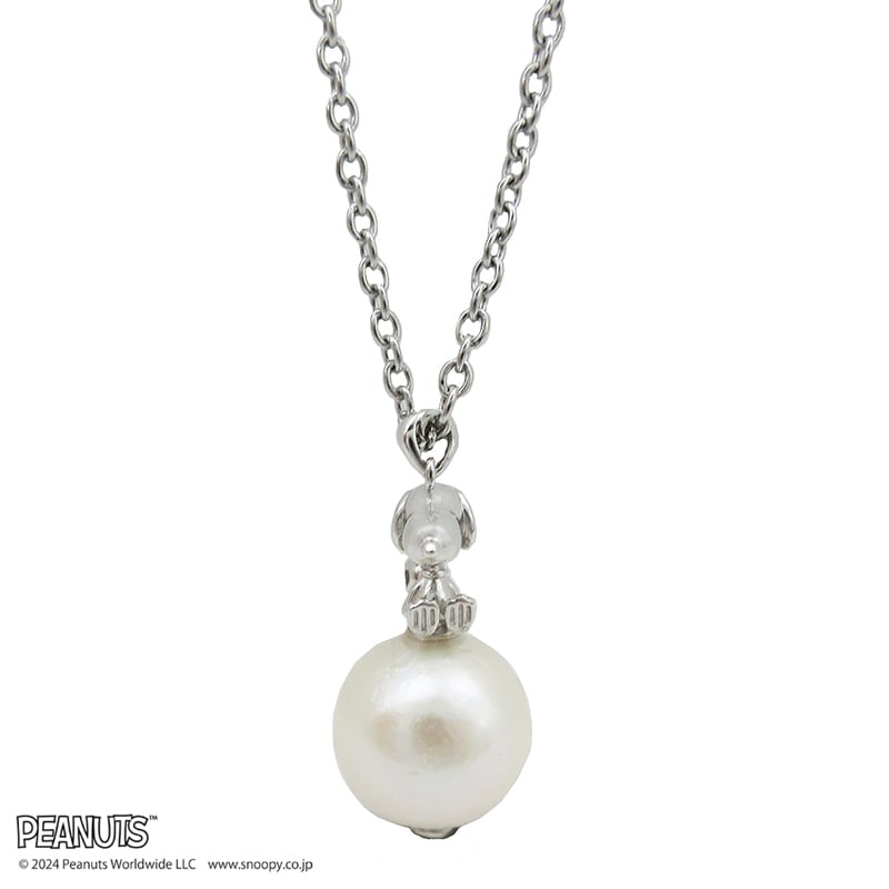 小さな3D立体のスヌーピーが淡水パールの上にちょこんとお座りをするペンダント。