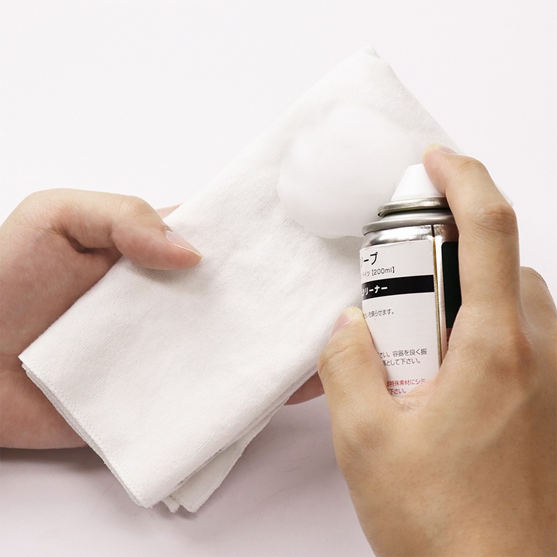 ②容器を良く振りポリッシングクロスにフォームを適量取り、まんべんなく塗布して汚れを落としてください。