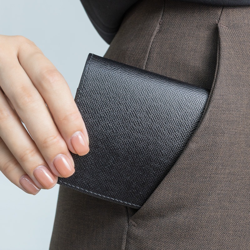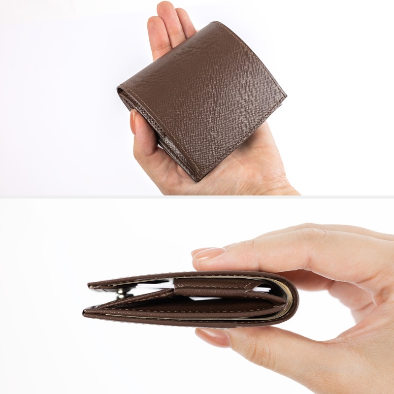 コンパクトながらお札10枚、小銭15枚、カード4枚が入る収納力を備えており、左右対称なデザインで利き手がどちらでも快適に使用できます。